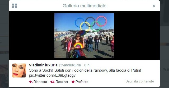 Ieri Luxuria è stata arrestata a Sochi, dove si trovava per assistere ad una partita di hockey, mi pare di capire, perché sventolava una bandiera arcobaleno, simbolo dell’LGBT (lo leggo in russo per abitudine: elghebeté), “alla faccia di Putin”.