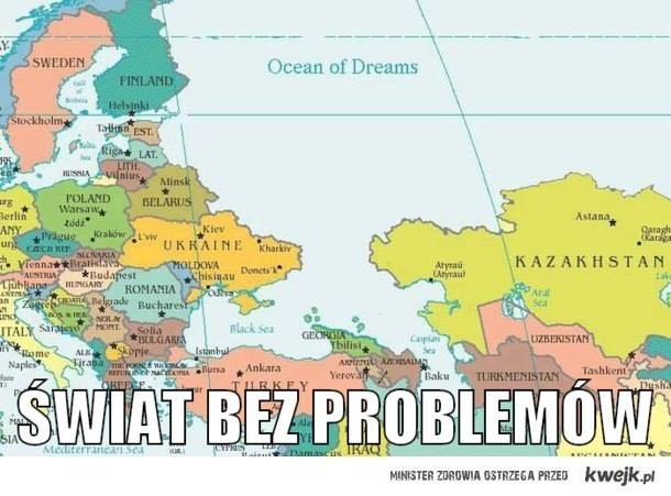 L’immagine rappresenta la carta dell’Europa con l’Oceano dei Sogni al posto della Russia e la scritta “Un mondo senza problemi” in polacco. Sarebbe di origini polacche la parte separatista occidentale dell’Ucraina. A vedere quest’immagine mi si è ghiacciato il sangue. Non capisco a cosa serva che sia morta della gente, non lo capivo già prima, ma lo capisco ancora meno adesso, se le loro buone ragioni poi vengono annebbiate da un odio cieco che riesce a immaginare la cancellazione di un paese in cui migliaia di persone tutto vogliono fuorché cancellare l’Ucraina. Non riesco ad immaginare me, nel caso che in Italia scoppiasse una rivoluzione, a postare un’immagine del genere, rinnegando totalmente il paese (o parte di un paese che ora non c’è più) di cui parlo la lingua, dal quale ho ereditato le tradizioni o che ha ereditato le tradizioni dal mio paese, con il quale ho una storia in comune; ma in generale non riesco ad immaginare me stessa nell’atto di postare una cartina senza un paese, probabilmente credendo che davvero quel paese possa essere la sola e unica origine di tutti i problemi del mio.