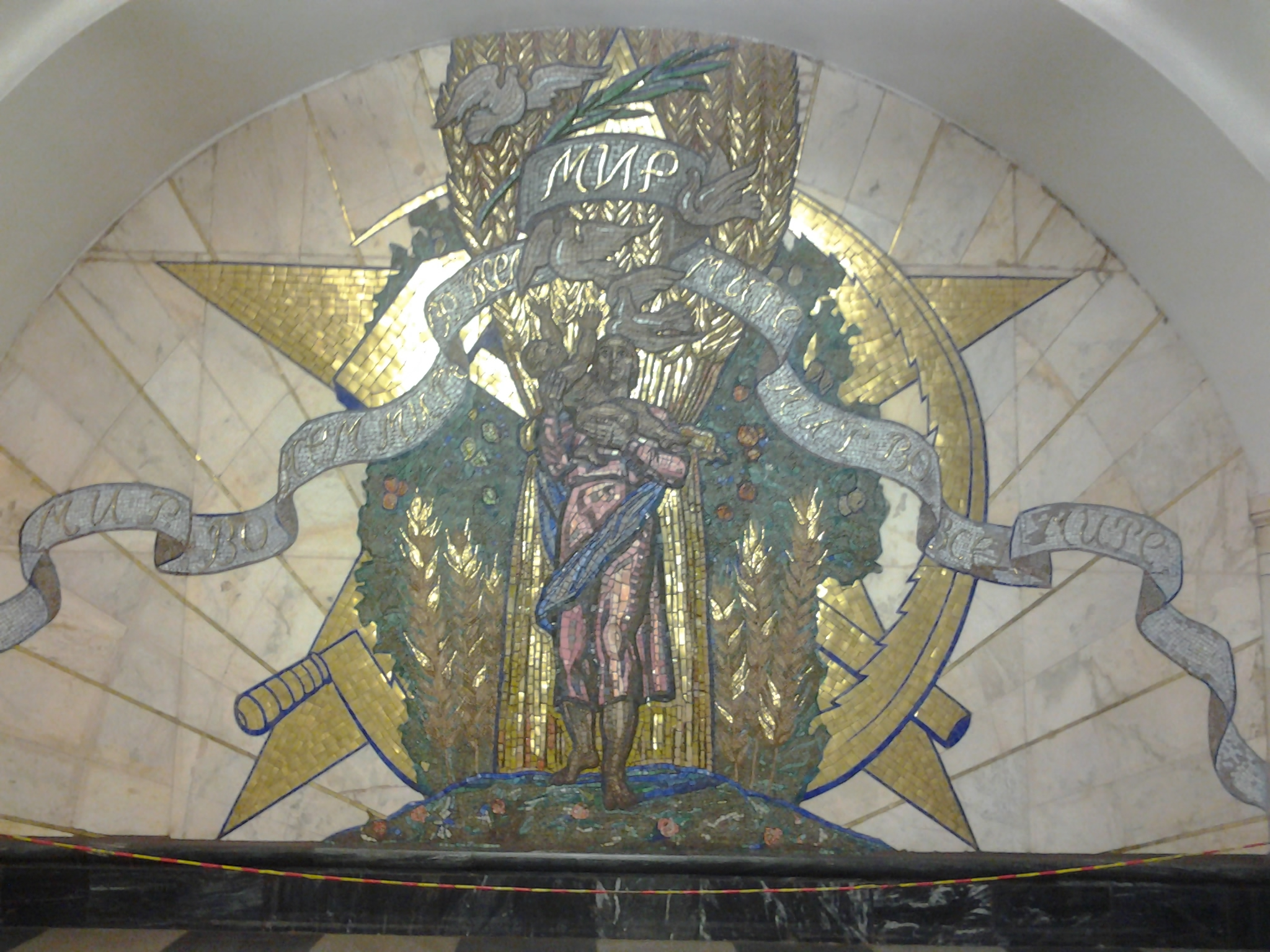 Questo è un mosaico che si trova nella stazione della metro Novoslobodskaja. Ci passo sempre, tornando dall’anticaffé in cui lavoro, ma solo oggi l’ho notato. La scritta sul nastro dice “Mir vo vsem mire”, cioè “Pace in tutto il mondo”, perché in russo “mondo” e “pace” sono omofoni e omografi e si scrivono entrambi “mir”. Per questo, anche quando Tolstoj ha scritto Guerra e Pace, in realtà ha anche scritto La Guerra e il Mondo. La Russia, così poco conosciuta all’Occidente salvo per Tolstoj, Dostoevskij, la Vodka, i gulag, è un paese molto grande, molto complesso, pieno di ricchezze, ma soprattutto è un paese che ha ospitato il primo e più grande esperimento di comunismo, che per quanto sia sfociato poi nelle sue varianti più violente e meno comuniste, ha lasciato le sue tracce, che sono una bellissima testimonianza del sogno, nei casi in cui il sogno c’era davvero, di creare un mondo più giusto in cui tutti sono fratelli e lavorano insieme per il bene comune.