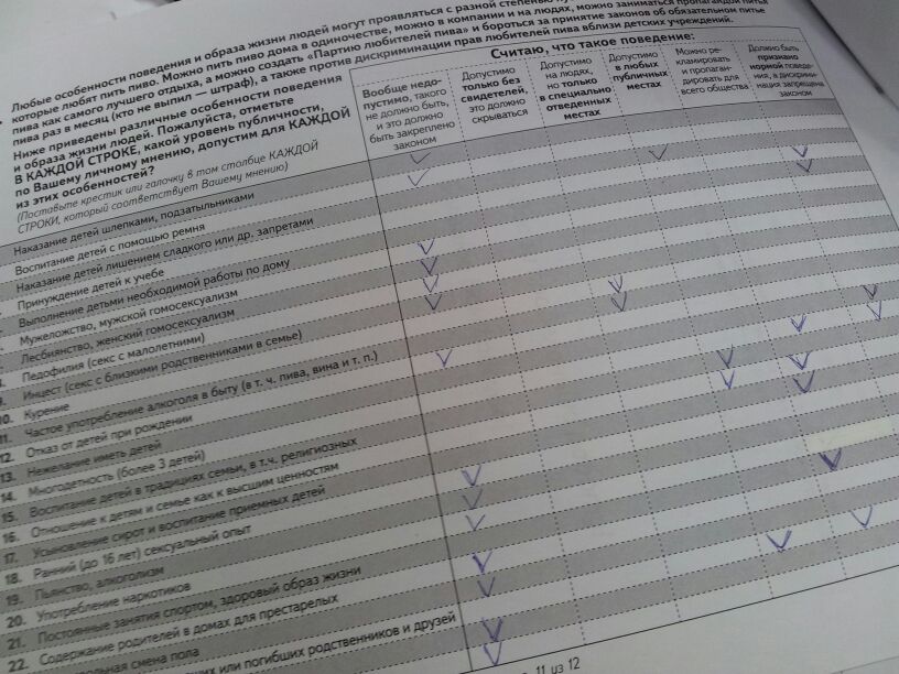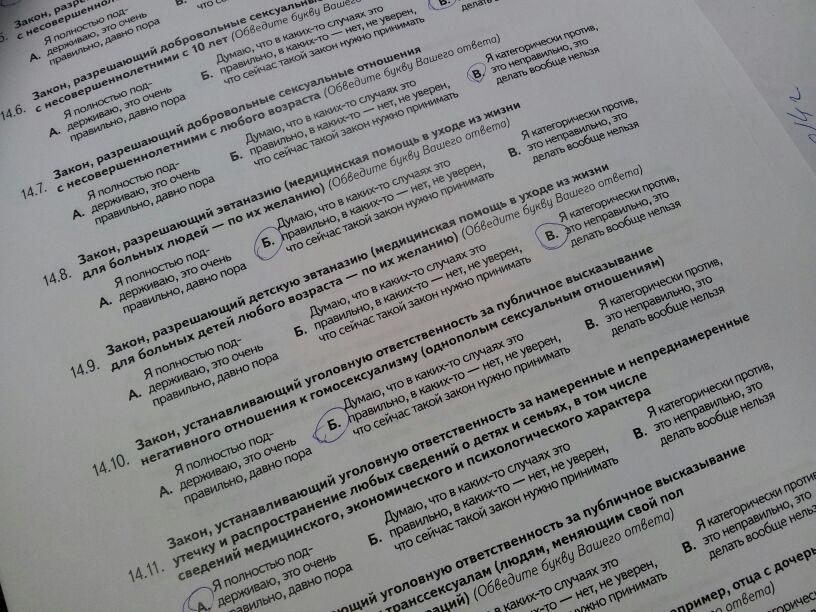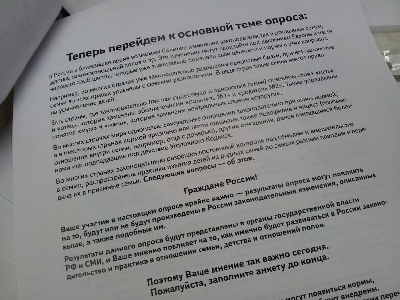 E l’abbiamo compilato, per intero, ma c’erano cose che ci lasciavano perplessi. Per esempio, nella prima immagine che vedete, con le risposte multiple, ci sono diverse domande su una legge che vieterebbe o approverebbe i rapporti con minori consenzienti, con minori consenzienti superiori ai 10 anni, con minori consenzienti di altre età… Messe in un ordine che inganna, perché dopo la domanda sul minore consenziente, dove ti immagini una ragazza di 16 con un ragazzo di 20, non ti aspetti che ti chiedano se approveresti che tuo figlio di 10 anni avesse rapporti sessuali tutelati dalla legge. Oppure, dove ci sono le domande sull’eutanasia, all’intervistatore sembra di capitale importanza distinguere tra l’eutanasia degli adulti e quella dei bambini; ma non definisce a quale età finisce l’infanzia, e i misteri di questa suddivisione sono oscuri. Lo stesso accade con una serie di domande pedanti sull’uso e la diffusione di informazioni riguardanti la salute, lo stato economico e sociale del nostri figli, come se per la salute, lo stato economico e quello sociale valessero gli stessi principi. Forse è necessario che uno psicologo condivida informazioni con un insegnante sullo stato di salute di un bambino, affinché psicologo, famiglia, bambino e insegnante risolvano il problema insieme; ma forse non è la stessa cosa se si tratta di quanto guadagnano i genitori del bambino e in che quartiere di Mosca vivono. Come possiamo rispondere bene se le tre cose sono raggruppate più volte nella stessa domanda? Forse dovevano occupare spazio e far credere che davvero qualche organo si stia interessando all’opinione dei cittadini? O forse chi ha scritto il test è troppo giovane e inesperto per realizzare un questionario bilanciato?