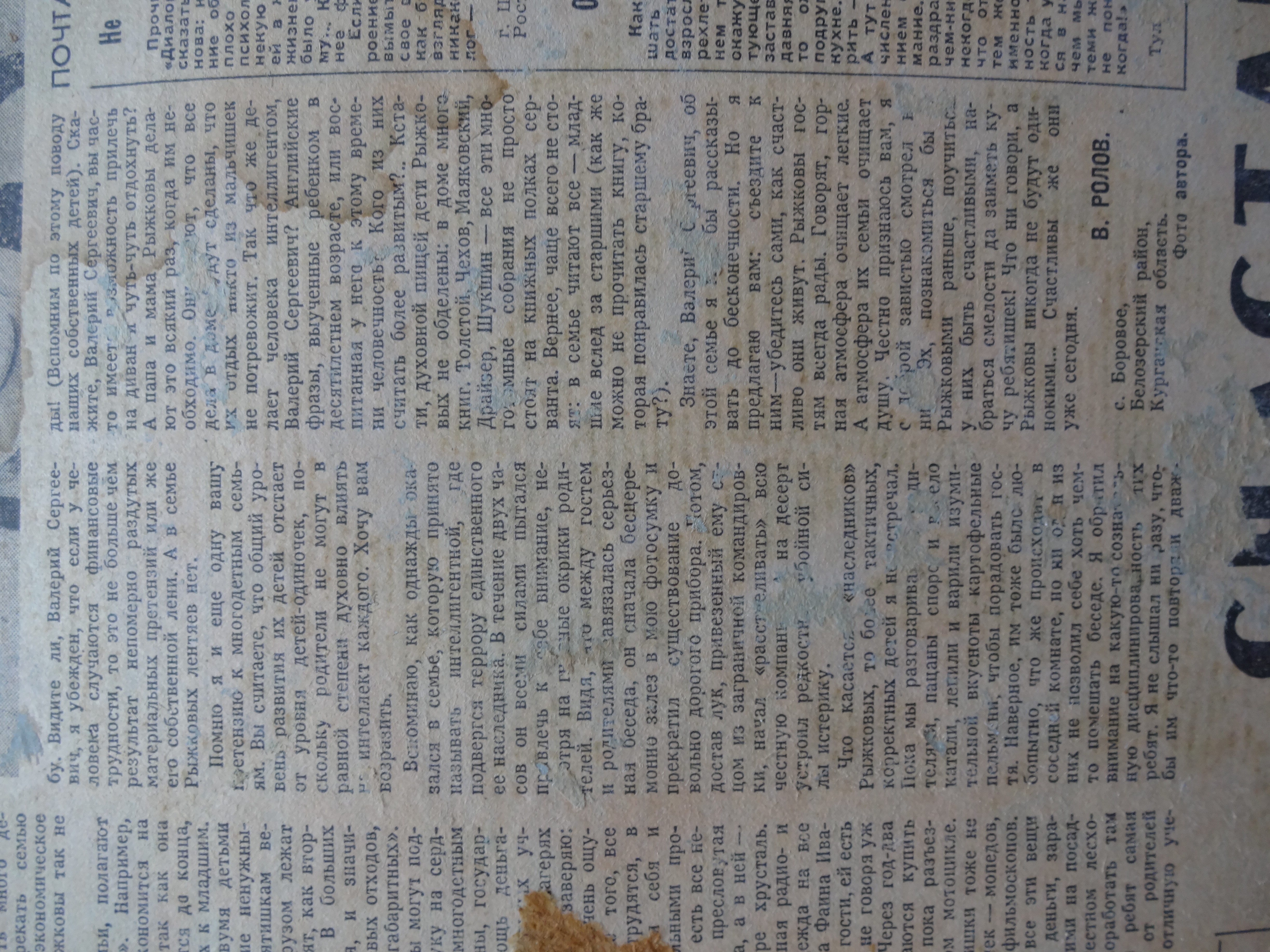 Per quanto riguarda gli “eredi” dei Ryzhkov, invece, io non ho mai incontrato bambini più educati e corretti. Mentre chiacchieravo con i genitori, i ragazzi [???], per far piacere all’ospite, arrotolavano, impastavano e cuocevano allegramente dei pelmeni di patate incredibilmente buoni. Probabilmente anche loro erano curiosi di sapere cosa succedesse nella camera accanto, ma nessuno di loro si è permesso in qualche modo di disturbare la conversazione. Ho notato un senso di consapevole autodisciplina in quei ragazzi. Non ho mai sentito che gli ripetessero la stessa cosa due volte! (Ricordiamo, a questo proposito, i nostri figli). Mi dica, Valerij Sergeevich, lei ha spesso la possibilità di stendersi sul divano e riposare un po’? Perché la mamma e il papà dei Ryzhkov lo fanno ogni volta che ne hanno bisogno. Loro sanno che tutto quello che c’è da fare in casa sarà fatto, che nessuno dei piccoli disturberà il loro riposo. Quindi, che cosa fa di una persona una persone perbene, Valerij Sergeevich? Che un bambino di dieci anni conosca già delle frasi in inglese o che, entro quell’età, abbia già sviluppato un senso di umanità? Quale di questi due bambini sarebbe più evoluto?.. A questo proposito, i piccoli Ryzhkov non sono privati di nutrimento intellettuale: in casa ci sono molti libri. Tolstoj, Chehov, Majakovskij, Dreiser, Pushkin – tutte queste corpose raccolte non si limitano a stare sulle mensole della credenza. Anzi, il più delle volte non ci stanno: in famiglia leggono tutti, i piccoli al seguito dei più grandi (come si può non leggere un libro che è piaciuto al fratello maggiore?).
