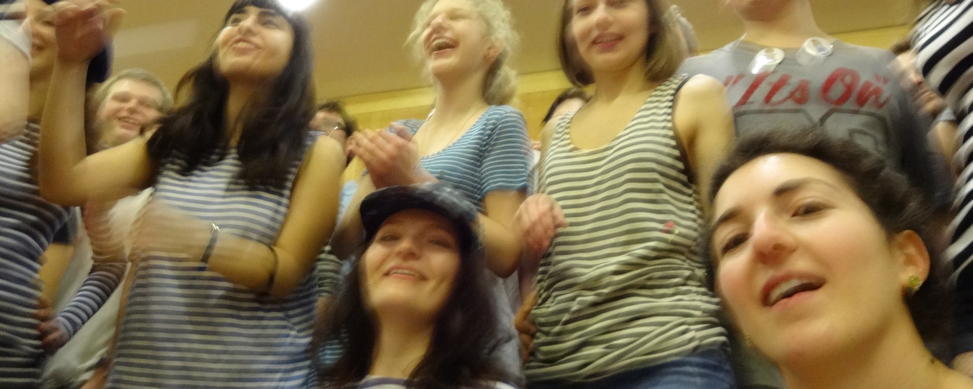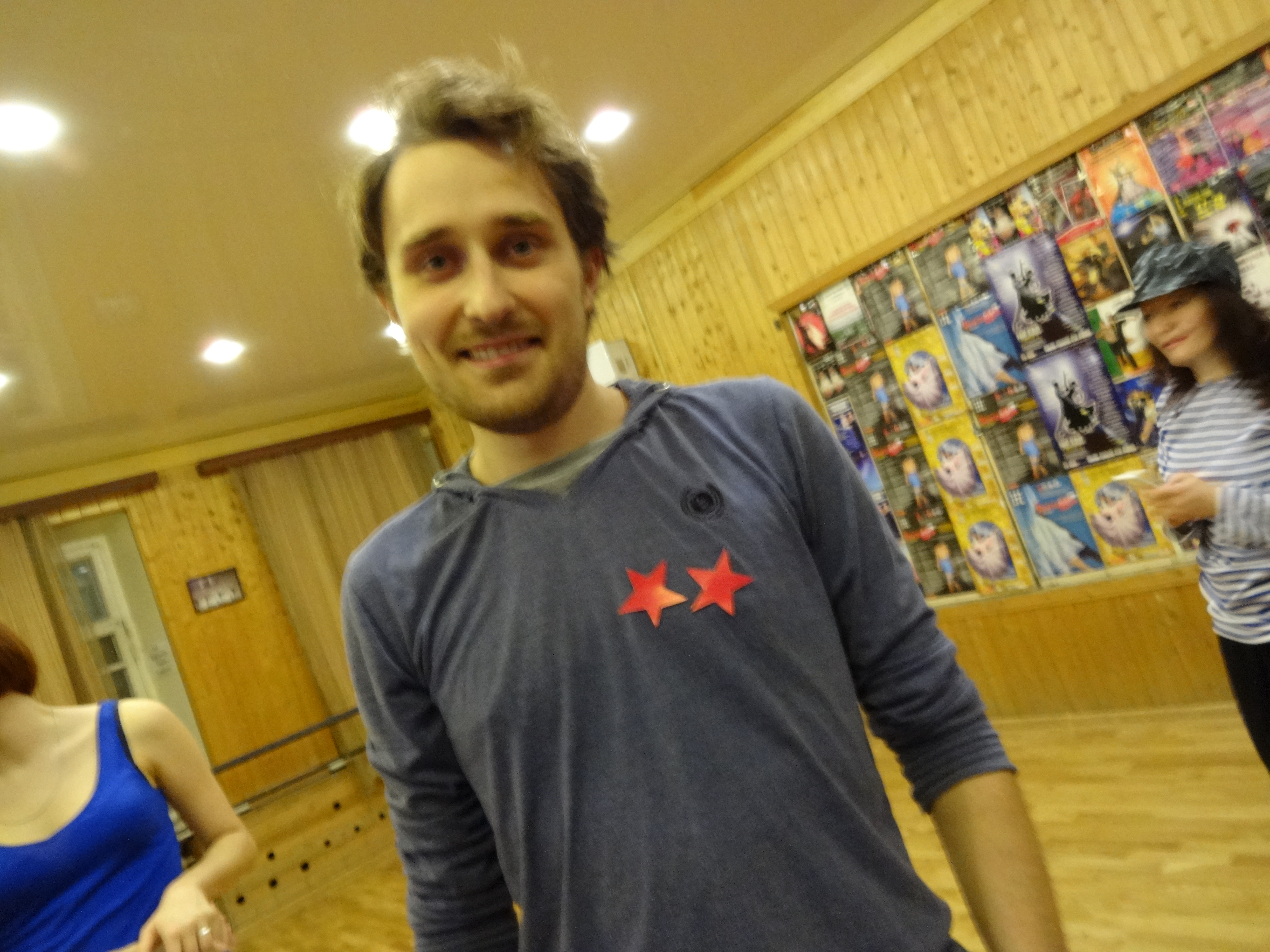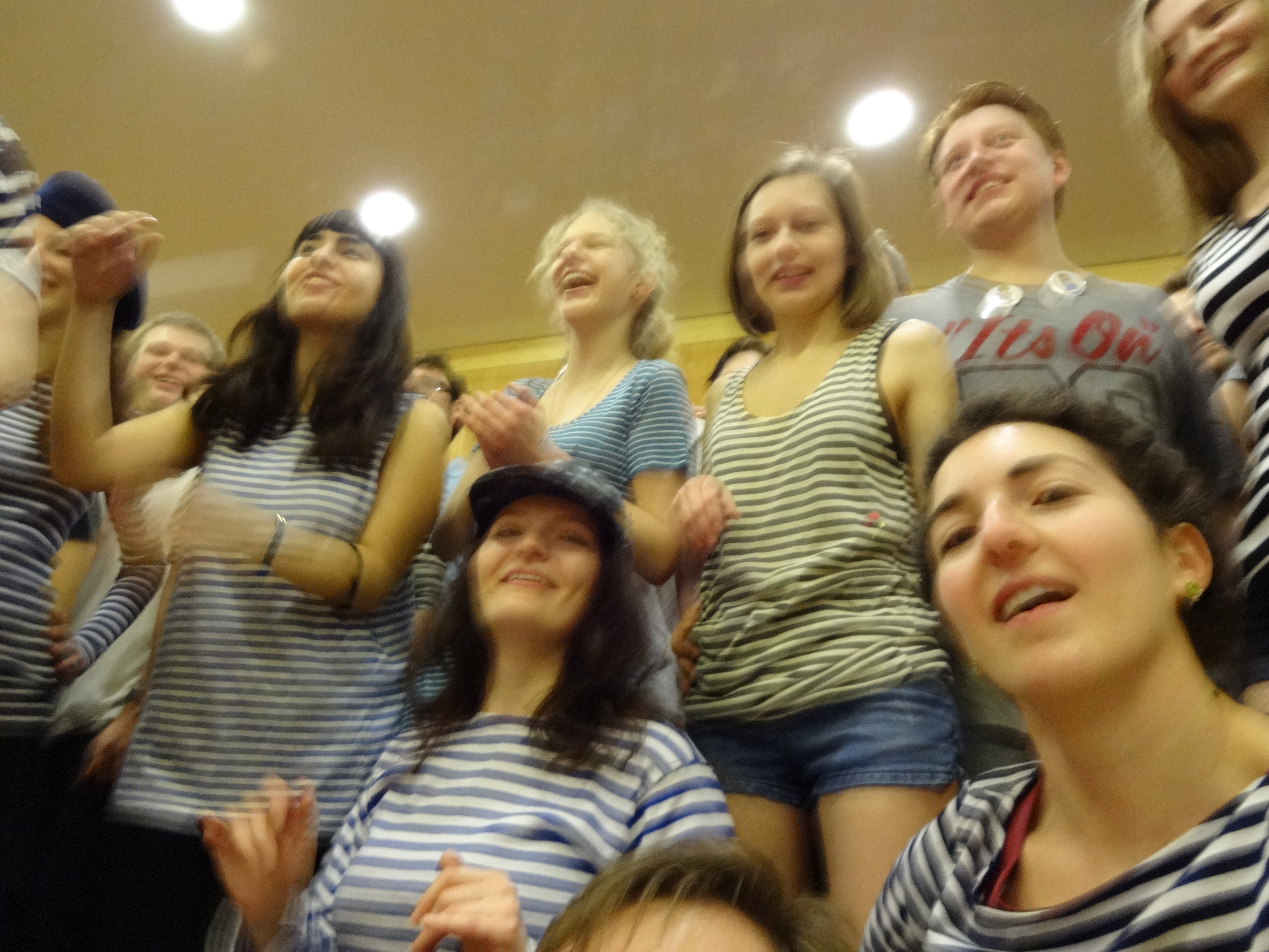Per questo mercoledì 25 l’assistente del maestro di ballo del gruppo avanzato di hustle della scuola ODS ha organizzato una sorpresa ai nostri partner. Tutte noi ragazze abbiamo indossato delle magliette a strisce blu e ci siamo attaccate sul corpo delle stelle, nei posti più imprevedibili (io sotto a un’ascella). Tra una lezione e l’altra siamo entrate in sala marciando sul passo base e poi l’assistente ha dato il via ad una jam session.