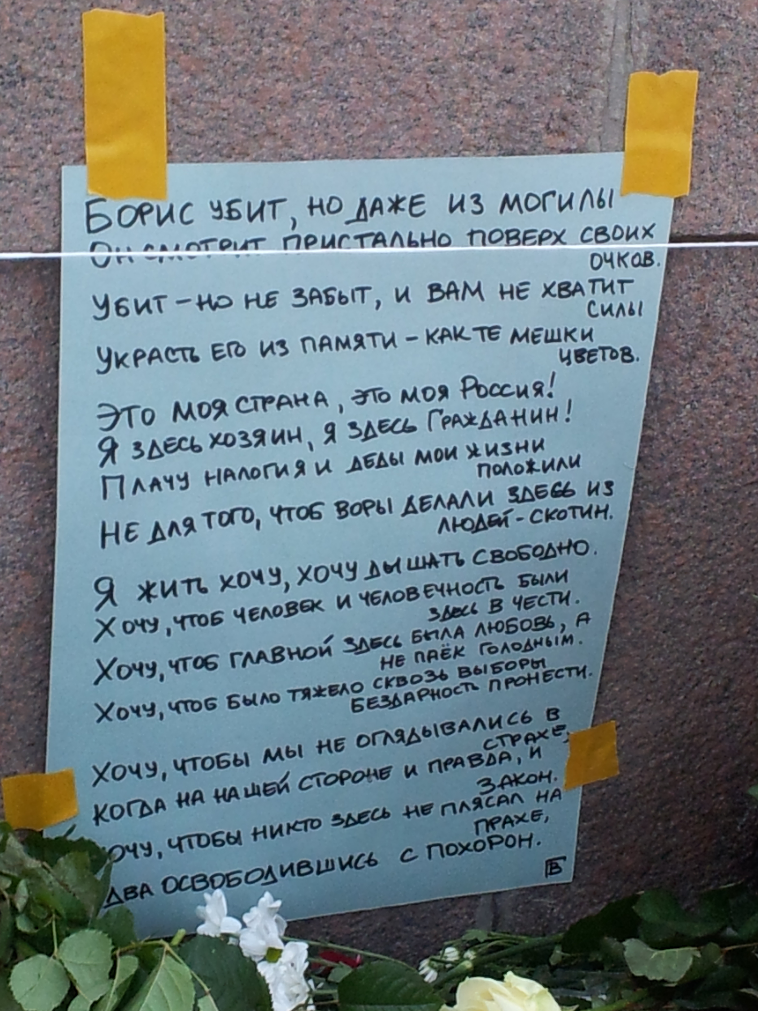 Io credevo che avessero ucciso Nemtsov proprio vicino alle mura del Cremlino, quindi abbiamo cominciato a parlare di come, di quando, del perché: le ipotesi, il valore del personaggio. Eravamo seduti in un caffé a pranzare, e sentivo chiaramente che l’uomo seduto al tavolo accanto aveva cominciato ad ascoltarci con curiosità. Chi saranno questi stranieri che parlano della Russia come se fosse roba loro e che sanno e vogliono sapere tutte queste cose.