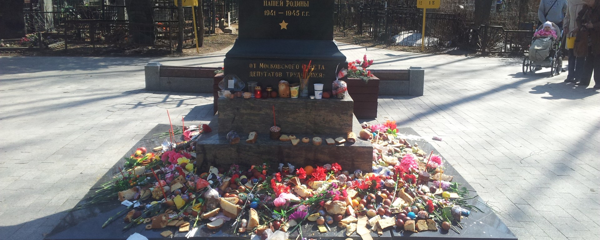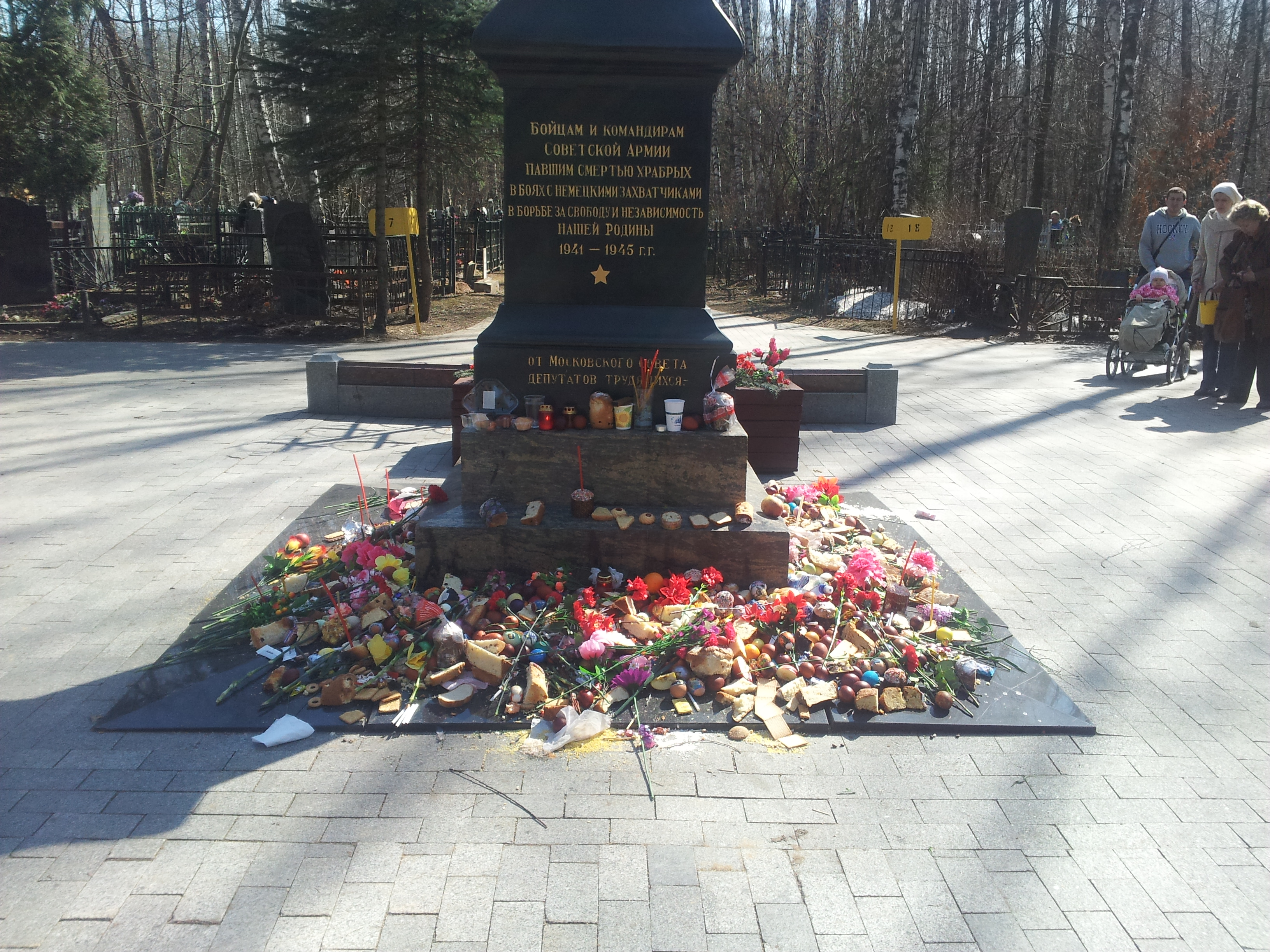 Passeggiando tra le tombe, noto che non è solo una tradizione di questa famiglia, ma che è proprio l’usanza, a Pasqua, lasciare del cibo sulle tombe. La Bratskaja mogila (la tomba comune, dove sono ricordati i soldati senza nome o i corpi non ritrovati) è coperta di uova, kulich, briciole di pane. Il nonno è molto stanco di camminare. Il sole ci riscalda e scioglie l’ultimo ghiaccio sulle tombe all’ombra delle betulle, che non sono ancora state visitate. Una ragazza con i lunghi capelli biondi sbriciola, spingendosi con la schiena dal lato opposto, come contro vento, l’ultimo pezzetto di kulich su una piccola lapide di marmo rosso che ricorda un soldato. Mentre il vento leggero trasporta le briciole e le posa tra le uova rosse, la ragazza si trascina via.