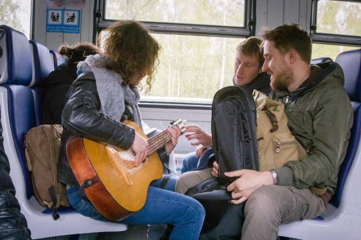 La mattina dopo siamo partiti per il Volga e mi sono portata dietro la mia chitarra sovietica sgangherata ricevuta in regalo da un amico peruviano che ce l’aveva per caso in camera sua. Ho pensato che il video l’avremmo girato lì, con il cellulare, sullo sfondo del fiume. Il posto dove siamo andati l’ho raccontato qui.